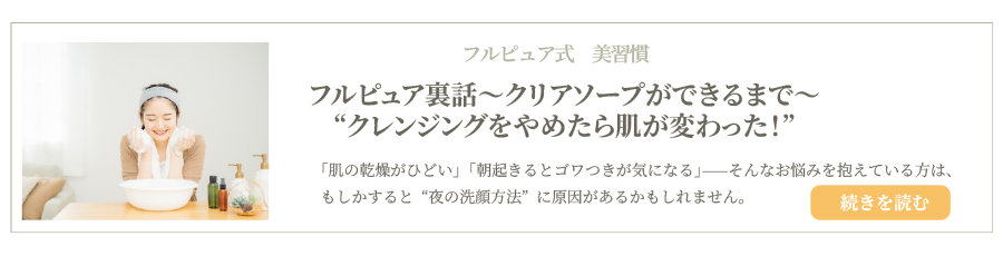 フルピュアでは“引き算ケア”をサポートするために、クリアソープや洗顔保湿ローションなど、肌の自立力を育てるアイテムをご用意しています。