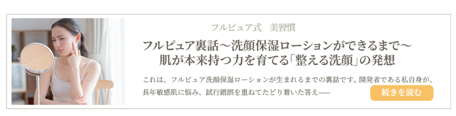 フルピュアでは、肌本来の整う力を引き出す“引き算ケア”を大切にしています。過剰に刺激せず、必要なものだけを取り入れることで、肌のリズムを崩さずに健やかさを保つのです。